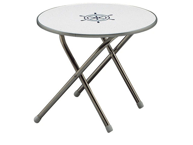 Weiße melaminbeschichtete Tischplatte mit nautischem Motiv, Untergestell Aluminium eloxiert und klappbar.