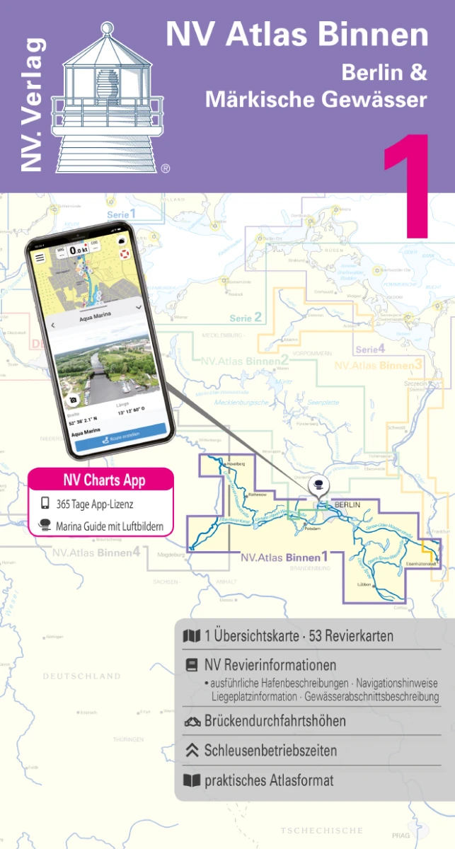 Die NV Sportschiffahrtskarten Binnen sind ein speziell für die Binnengewässer konzipiertes farbiges Kartenwerk im Maßstab 1:35 000. Die Karten wurden nach dem Konzept, praktisch in der Handhabung und präzise in den Informationen, erarbeitet. Großmaßstäbige Details und straff gefaßte Texte informieren über die Wassertiefen, Durchfahrtshöhen, Schleusen, Liegeplätze und Sehenswürdigkeiten. Ein Register und ein Übersichtsplan machen das Finden des Gebietes einfach und schnell. Ein Emblem auf jeder Seite verrät den Standort im Revier. Die logische, klare Aufteilung erleichtert die Orientierung ebenso wie die Kilometrierung am Kartenrand. Rot hervorgehobene Gefahrenstellen und Ansichten von markanten Punkten runden das mehrbändige Kartenwerk ab.