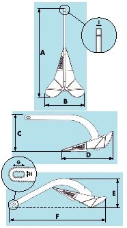 Bootslänge – Haupt-Ankerplatz: Beiboot gross / Zweit-Ankerplatz: 6 m Kobra Anker, klappbar (patentiert) Schnelles Eingraben und besonders guter Halt durch eine schwere Spitze und sehr breite Flunken. Verzinkter Stahl. Dank seiner herunterklappbaren Ankerschaft kann der Kobra-Anker entweder an der Bugrolle befestigt oder ohne jegliche Anstrengung im Ankerkasten verstaut werden. Sehr hohe Haltekraft dank spezieller Konstruktions-Geometrie. Sie können deshalb bis zu 2 Grössen unterhalb des normalerweise empfohlenen Ankergewichtes auswählen. Der Anker kann sehr wirksam auch mit einer einfachen verbleiten Ankerleine für einen kurzen Zwischenstopp benutzt werden -ganz mühelos auch ohne Ankerwinde. Abmessungen : A : 523 mm / B : 236 mm / C : 218 mm / D : 310 mm / E : 170 mm / F : 567 mm Das Ankergewicht gilt lediglich als Richtgrösse für die verschiedenen Bootslängen. Berücksichtigen Sie bei der Auswahl Ihres Ankers zusätzlich Ihren Bootstyp.