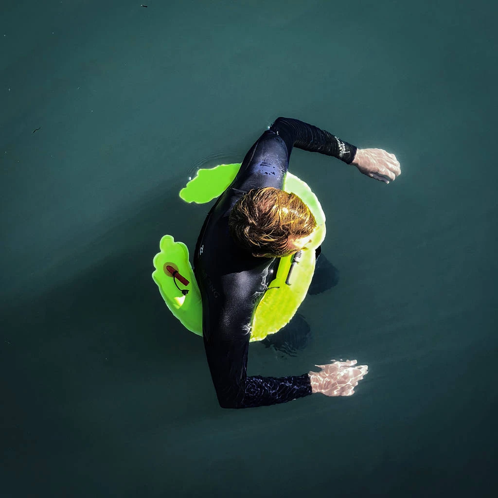 Die Auftriebshilfe unterstützt durch die Hufeisenform um den Oberkörper und unter den Armen.