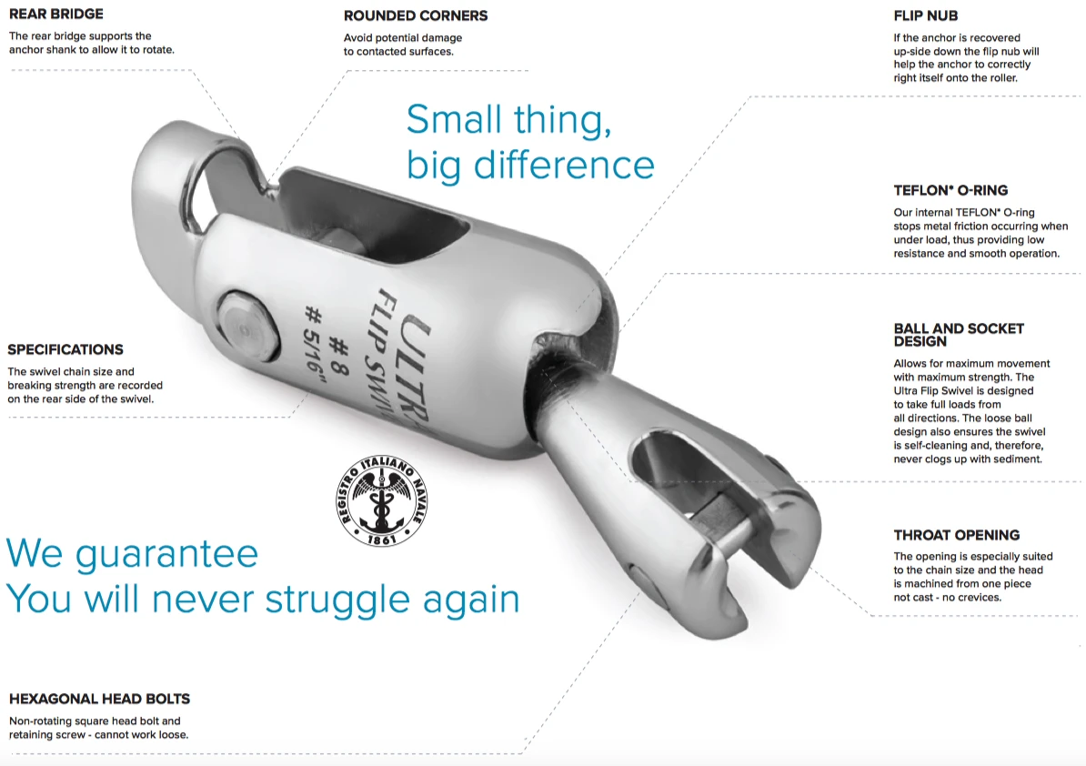 Der Ultra Marine Ankerwirbel ist extrem stark und dünn und erfordert keine Verriegelungsstifte oder Sicherheitsclips.