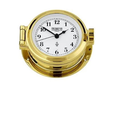 Nautik BULLAUGENUHR, arab. Massives Messinggehäuse Ø 120mm, hochglanzpoliert und farblos lackiert, Quarz Batteriewerk, Zifferblatt weiß mit arab. Zahlen.