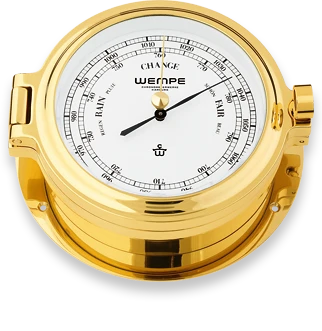 Cup MESSING BAROMETER Massives Messinggehäuse Ø 140mm, hochglanzpoliert und farblos lackiert, Zifferblatt weiß mit Skala hPa/mm.