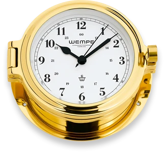 Cup MESSING BULLAUGENUHR Massives Messinggehäuse Ø 140mm, hochglanzpoliert und farblos lackiert, Quarz Batteriewerk, Zifferblatt weiß mit arab. Zahlen.