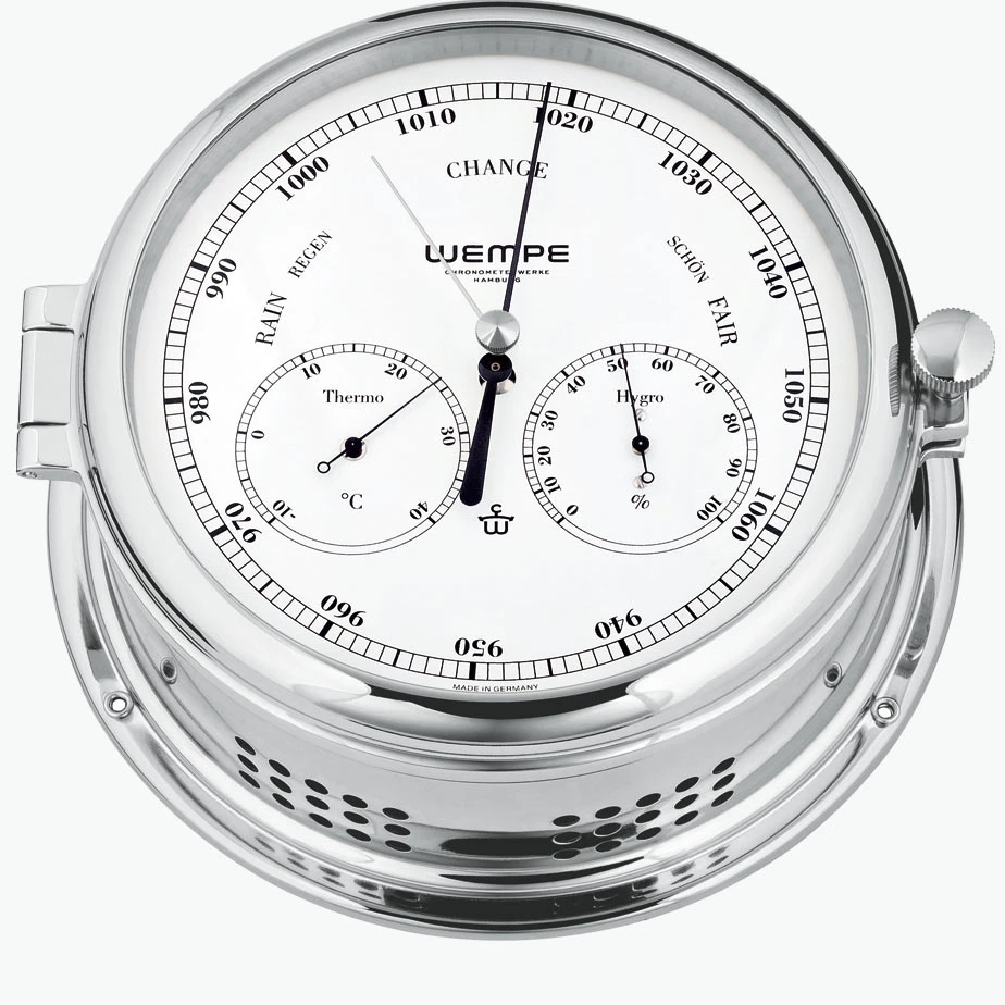 Wie schon die Serie Bremen erscheint auch unsere größte Serie ADMIRAL in einem neuen „Gewand“. Als Neuheit in dieser Serie ist ab sofort ein Kombinationsinstrument mit einem Doppeldosen-Barometer, Thermometer und Hygrometer lieferbar. Ein weiteres Highlight sind die neuen Instrumente der Serie ADMIRAL II mit verchromten Gehäuse und weißem Zifferblatt mit zweifarbig blauer Skala. Ein wunderschöner Blickfang!Kombi-Messinstrument ADMIRAL II Messing verchromt Doppeldosen-Barometer kombiniert mit Thermo- und Hygrometer