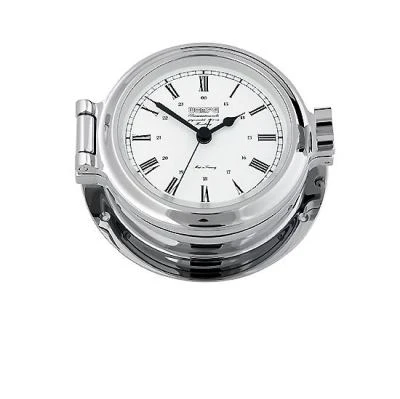 Massives Messinggehäuse Ø 120mm, hochglanz verchromt, Quarz Batteriewerk, Zifferblatt weiß mit röm. Zahlen.